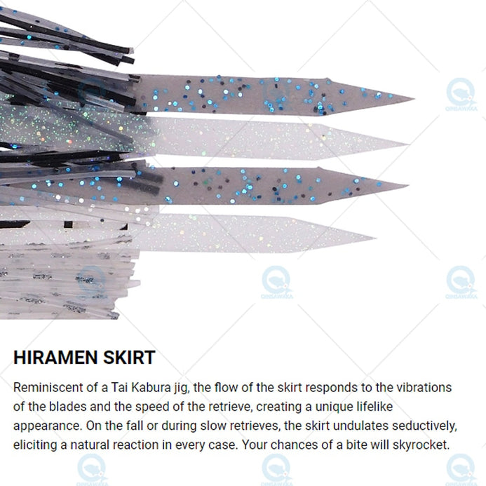 Reminiscent of a Tai Kabura jig, the flow of the skirt responds to the vibrations of the blades and the speed of the retrieve, creating a unique lifelike appearance. On the fall or during slow retrieves, the skirt undulates seductively, eliciting a natural reaction in every case. Your chances of a bite will skyrocket.