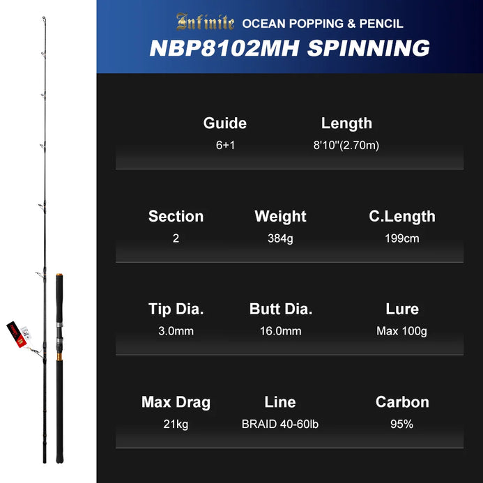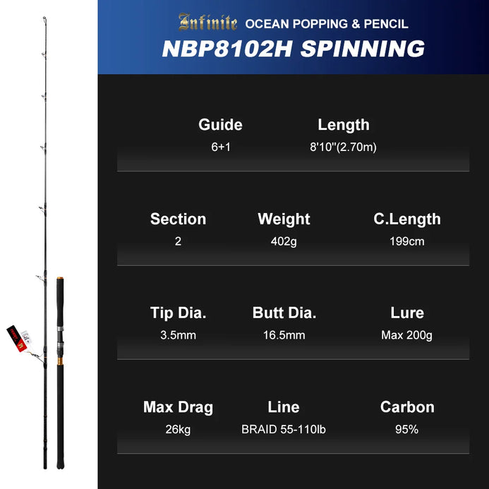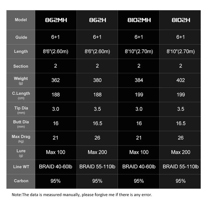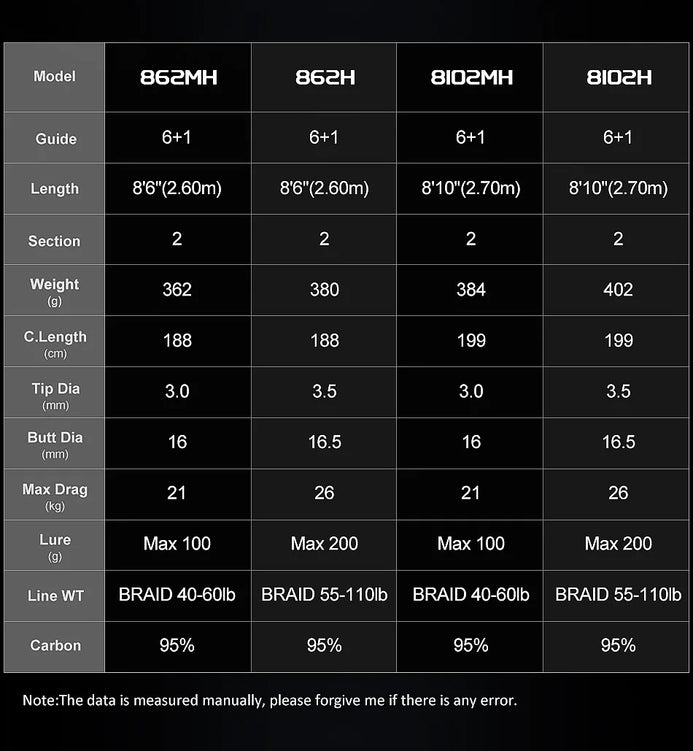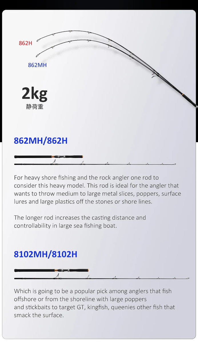 862MH and 8102MH rod will best pair with a 6000 or 7000 or 8000 size spinning reel; 862H and 8102H rod will best pair with a 7000 or 8000 or 12000 size spinning reel.