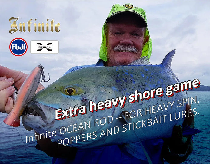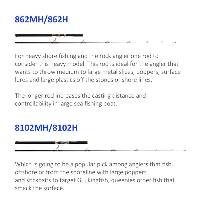 For Heavy shore fishing and the rock angler one rod to consider this heavy model. This rod is ideal for the angler that wants to throw medium to large metal slices, poppers, surface lures and large plastics off the stones or shore lines.
