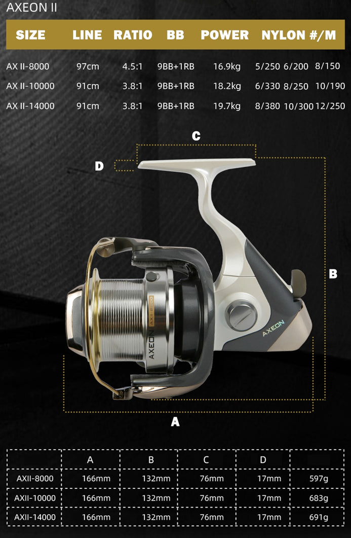 Built with an impressive 16.9–19.7 kg of drag power, this reel gives you the torque and backbone to dominate hard-fighting species from the shore. Whether you’re battling stripers, drum, or even larger predators, the AXII SURF has the stopping power you need.