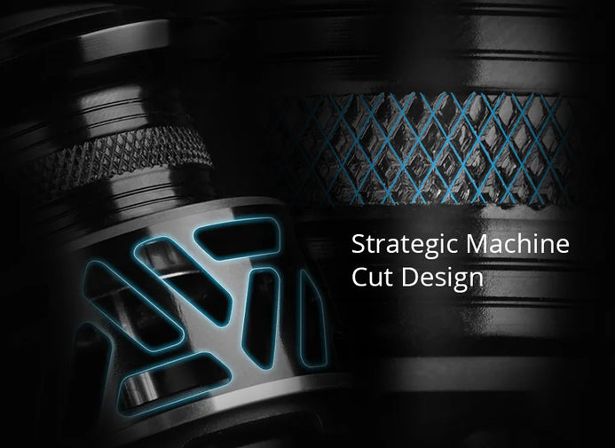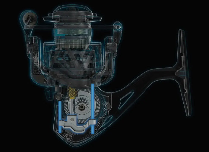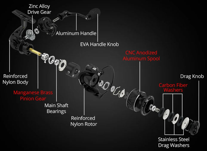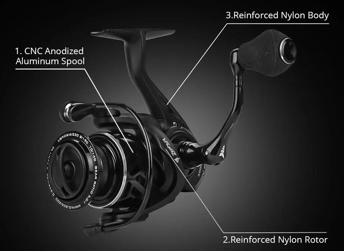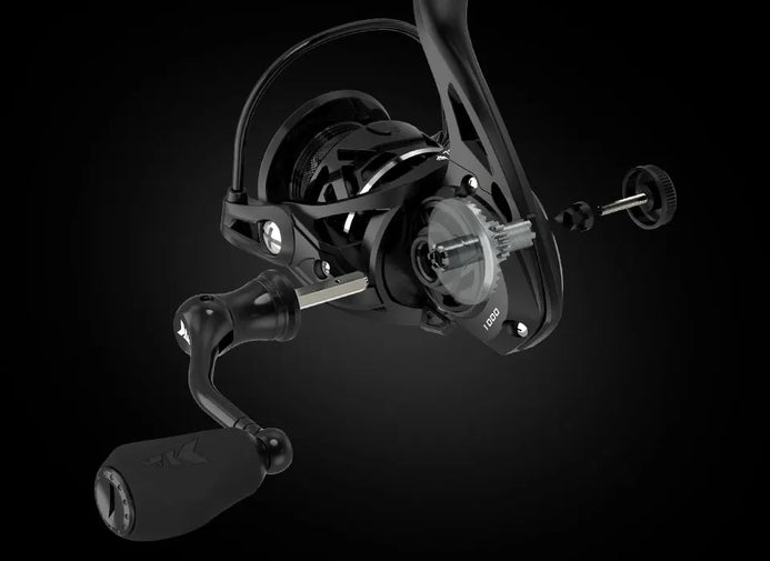 Zephyr spinning reels have a rugged, stealthy tone on tone (gloss and flat black) paint scheme with strategic cutouts added to keep the weight down and maintain a tactical look. A black EVA knob adds to the blackout package