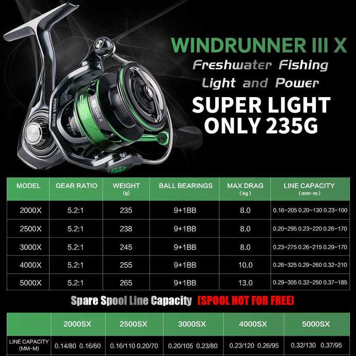 WR III 3000 | Gear Ratio: 5.2:1 | Weight: 248g | Bearings: 10BB | Max Drag: 6KG | Line Capacity: 0.23-275 0.26-215 0.29-170