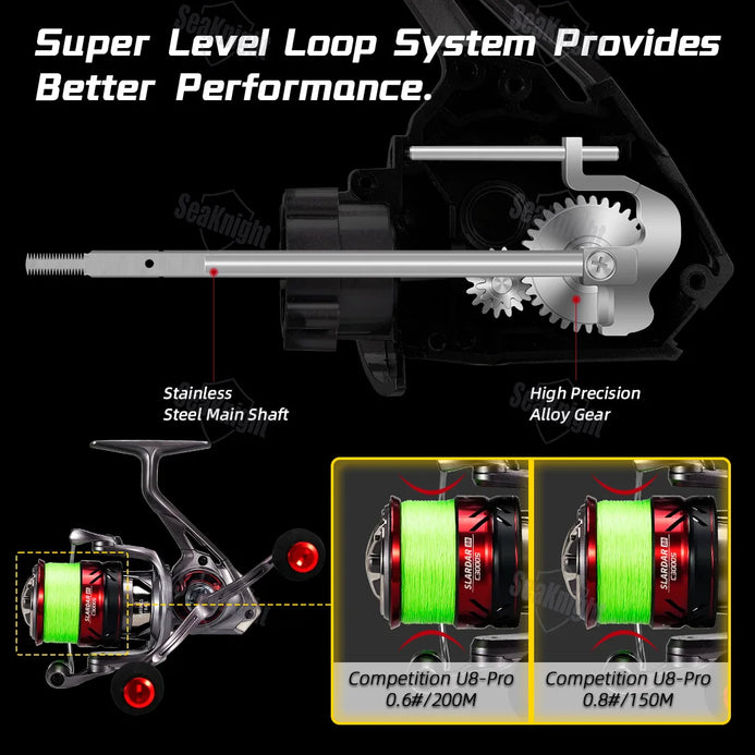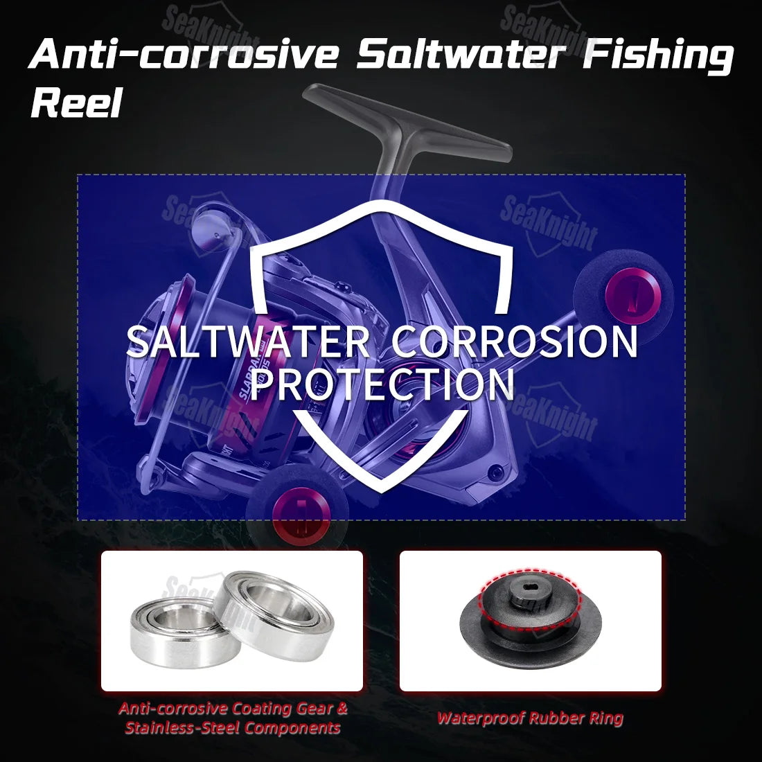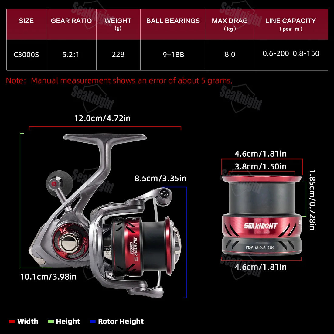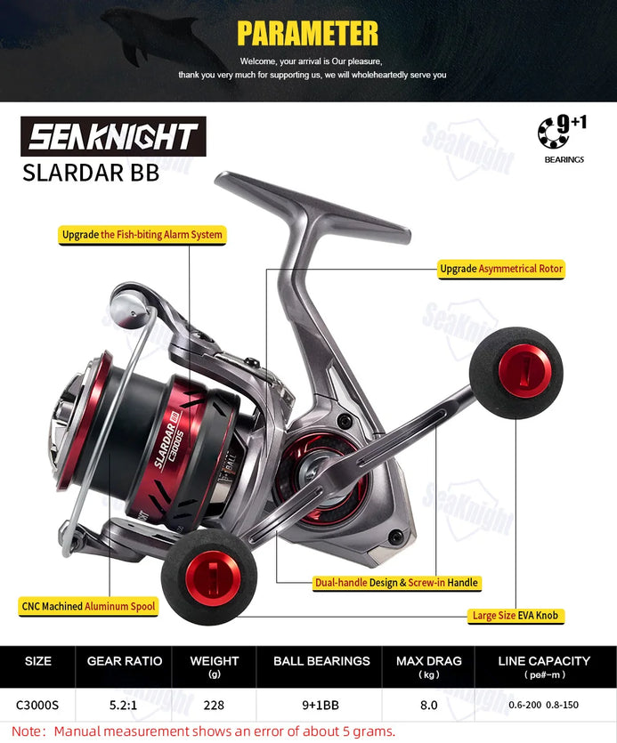 Master the waters with the SeaKnight SLARDAR BB Series Spinning Reel—engineered for anglers who demand precision and power. This 3000 Series beast delivers 9+1 ball bearings for buttery-smooth casting and retrieval, while its 5.2:1 gear ratio keeps you in control of every strike. At just 228g, it's lightweight enough for all-day comfort yet tough enough to handle 8kg of max drag pressure. Whether you're chasing freshwater trophy fish or testing your skills in saltwater conditions, this reel combines reliability with aggressive performance. Built for the angler who refuses to compromise.