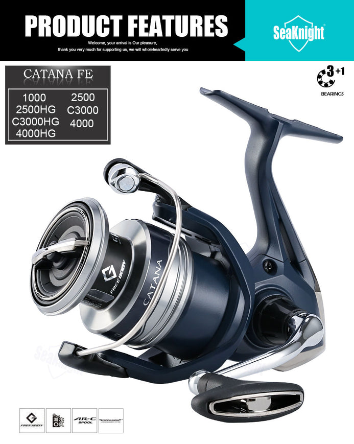Shimano designed the all-new Catana FE family of spinning reels with precision, power and performance for the budget-minded angler looking to get out and enjoy a day on the water. Lighter than previous generations, the new Catana FE features a redesigned body and rotor combined with an upgraded handle knob and 3+1 bearings for smoother reeling performance. Catana FE also features Shimano's G-Free Body and Propulsion Line Management System for all-day comfort and trouble-free casting. Without sacrificing performance, anglers can rely on Catana to get out on the water and have fun.