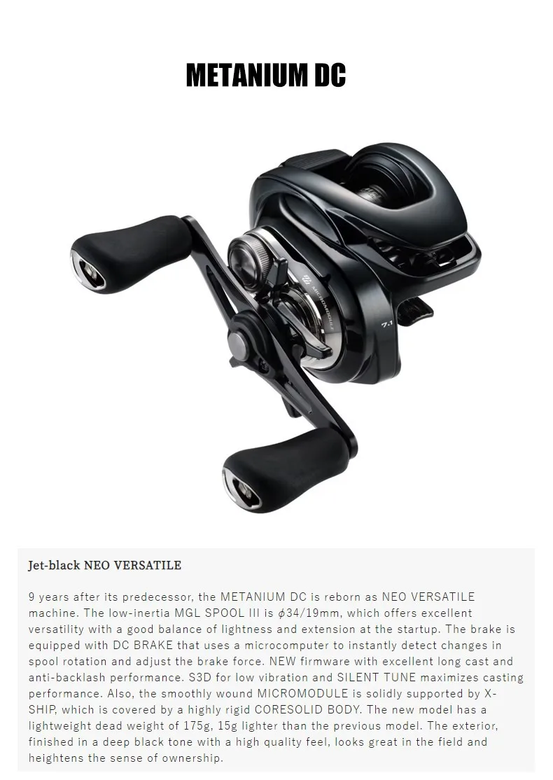 9 years after its predecessor, the METANIUM DC is reborn as NEO VERSATILE machine. The low-inertia MGL SPOOL III is φ34/19mm, which offers excellent versatility with a good balance of lightness and extension at the startup. The brake is equipped with DC BRAKE that uses a microcomputer to instantly detect changes in spool rotation and adjust the brake force. NEW firmware with excellent long cast and anti-backlash performance. S3D for low vibration and SILENT TUNE maximizes casting performance. Also, the smoothly wound MICROMODULE is solidly supported by X-SHIP, which is covered by a highly rigid CORESOLID BODY. The new model has a lightweight dead weight of 175g, 15g lighter than the previous model. The exterior, finished in a deep black tone with a high quality feel, looks great in the field and heightens the sense of ownership.