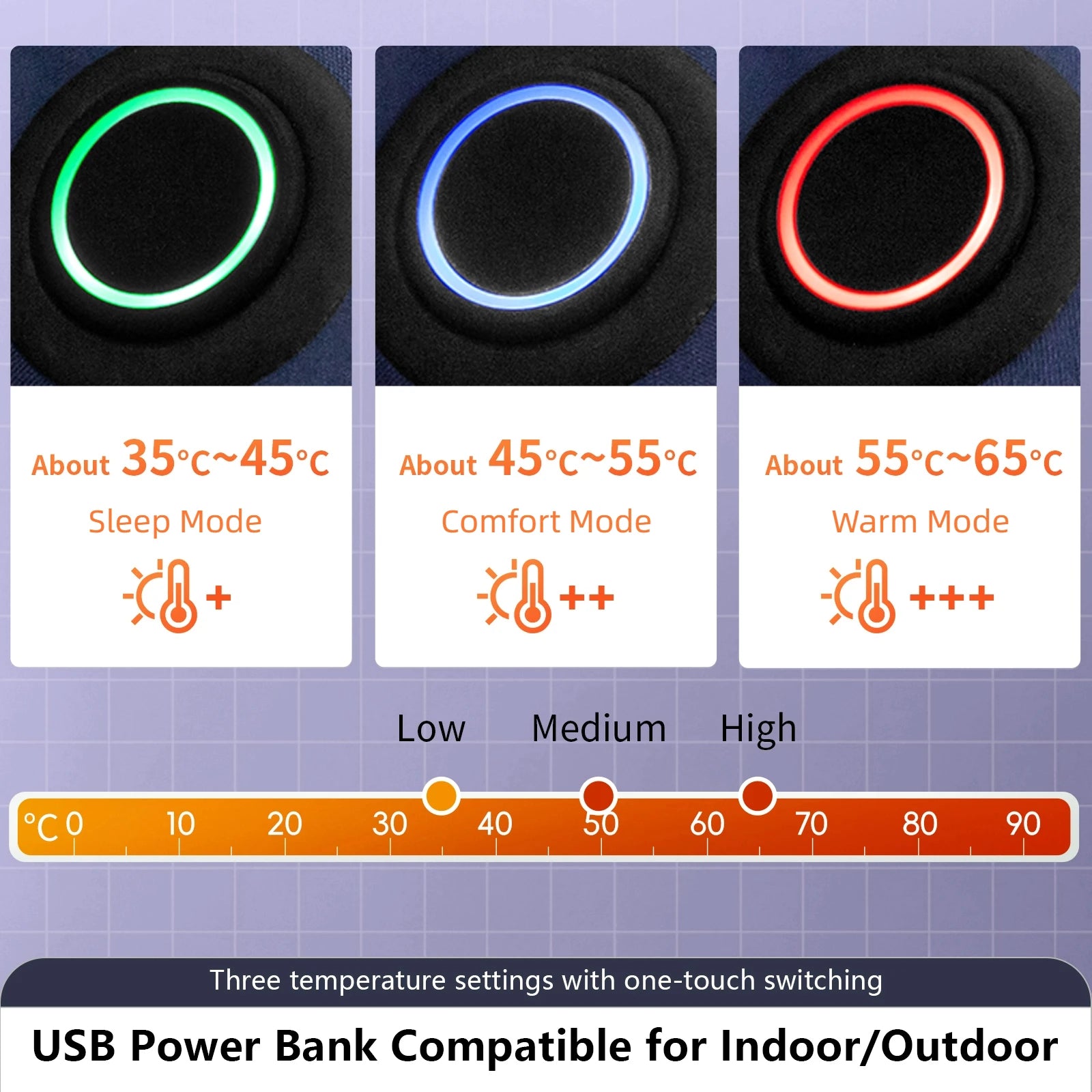 Heating pads are distributed on the waist and feet, supporting USB connection power bank, (the output voltage needs to be 5V/2A)