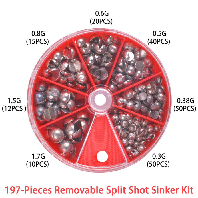 This 197-piece split shot sinker kit is perfect for targeting big game fish like walleye, muskie, trout, big bass and salmon. The kit includes sinkers in five different sizes, ranging from 0.3g to 1.7g, to suit your fishing needs. This kit will provide you with the perfect set of sinkers to cover any fishing situation.