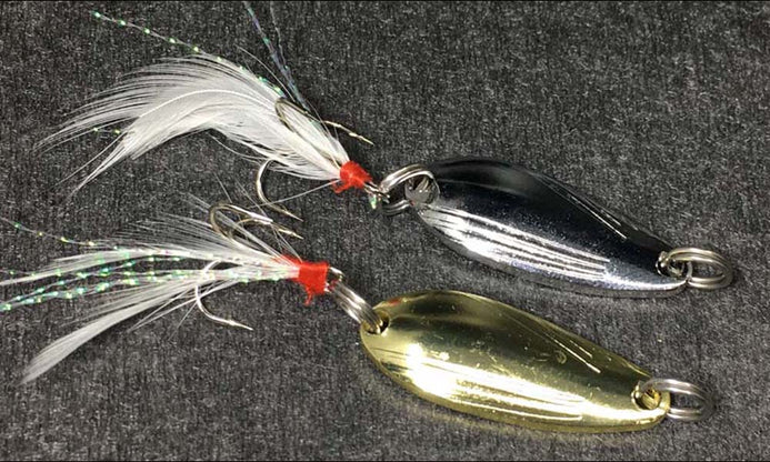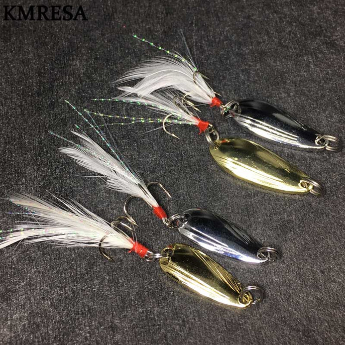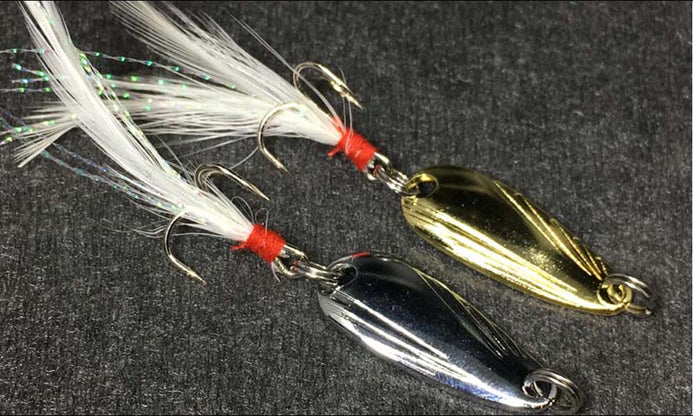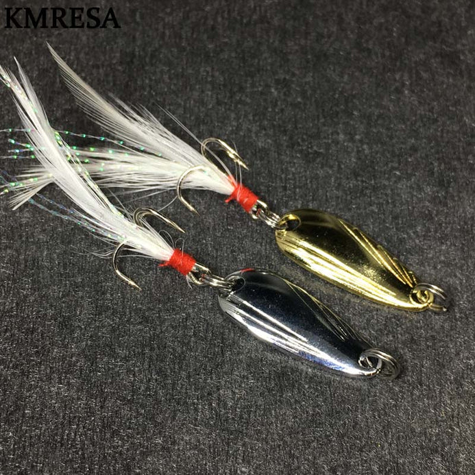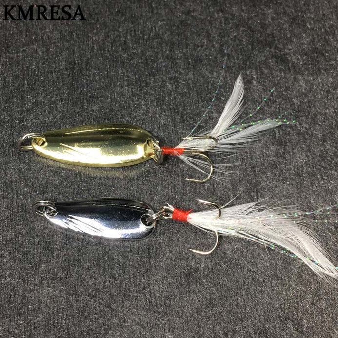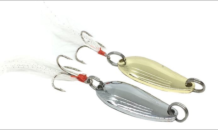 Check out these quality Metal spoons with a a treble hook and feather. Available in Silver and Gold colors. These lures are perfect for catching Bass and Pike! They are my personal favourite!