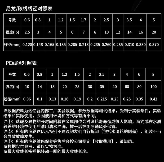 Model Gear Ratio Retrieve (cm/turn) Bearings Weight Max Drag Mono/Braid Capacity