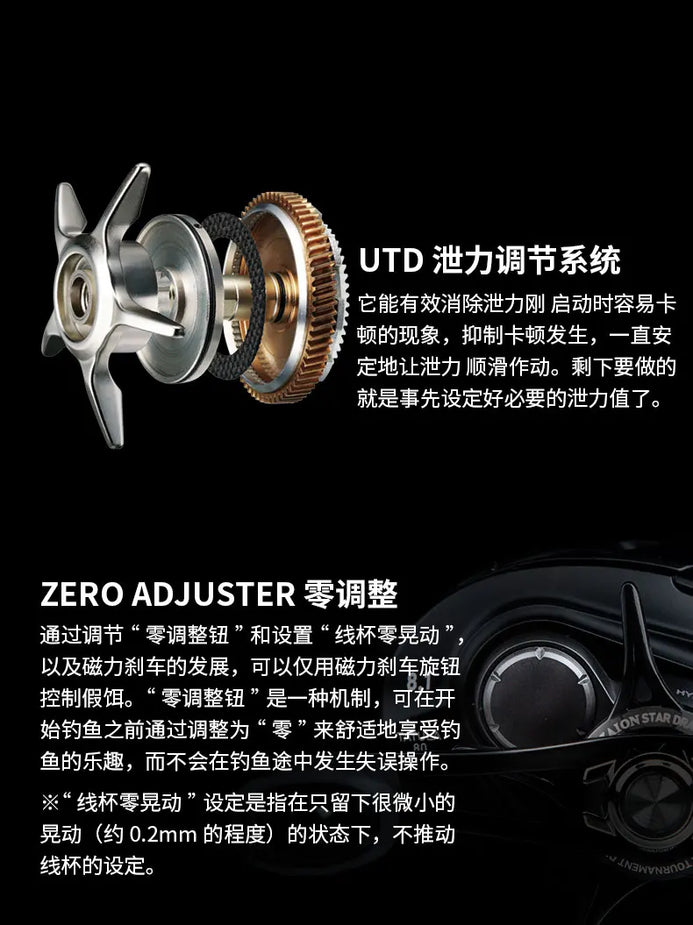• Ultimate Tournament Drag (UTD) – Carbon-stainless multi‑disc drag system delivering up to 9.9 lb (≈4.5 kg) of seamless stopping power.