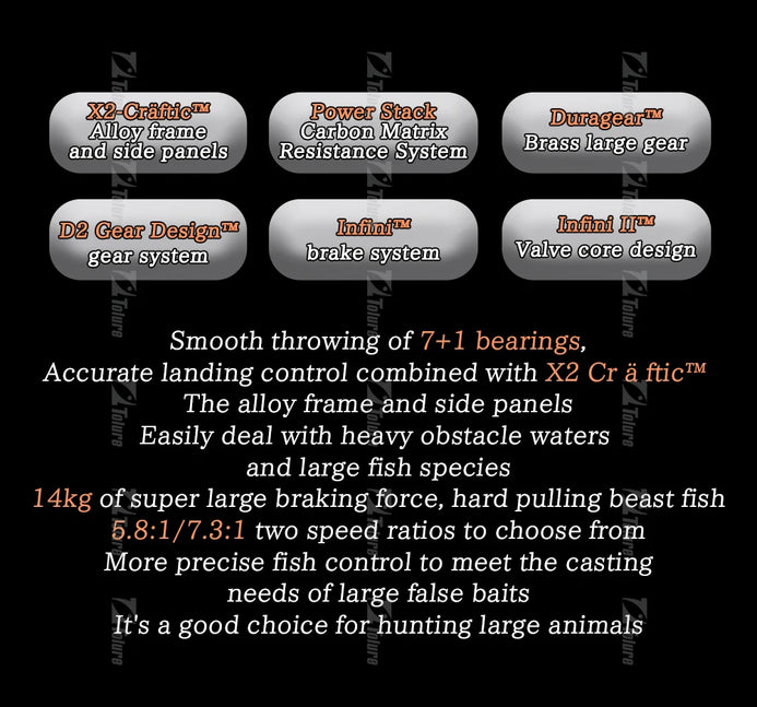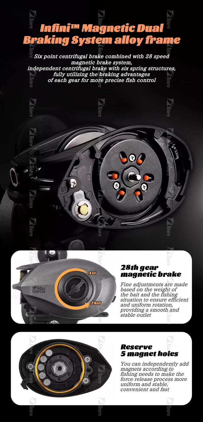 • Infini™ Brake System: Combines centrifugal and magnetic braking for precise cast control and reduced backlash, even with heavy lures.