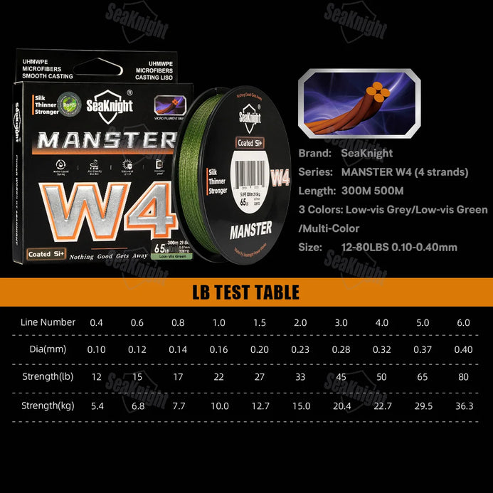 SeaKnight W4 Series Line X4 PE Braided Line 12-80LB 300M/500M 0.4#-6.0#