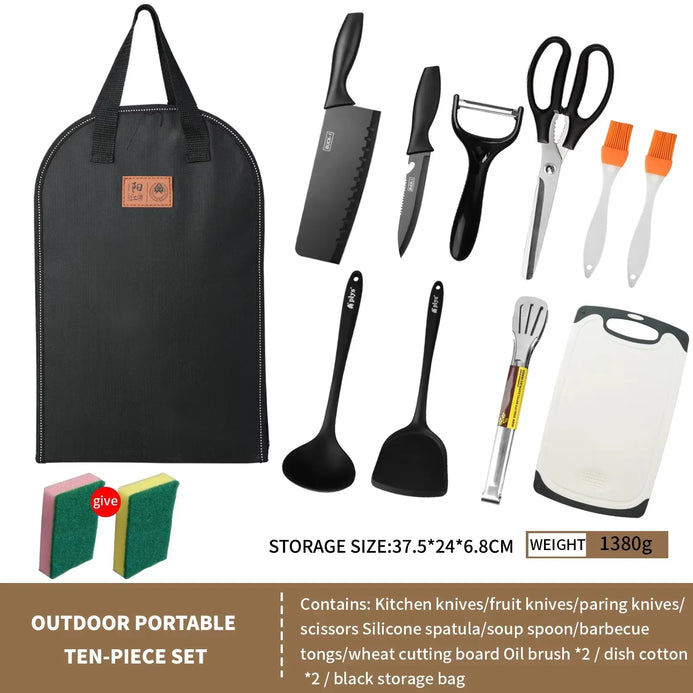 【10-in-1 Portable Camping Kitchen】- All-in-One Cooking Solution! This set includes kitchen knife, fruit knife, paring knife, scissors, spatula, soup spoon, BBQ tongs, cutting board, 2 oil brushes & dish cloths. Covers everything from prepping to grilling and serving.