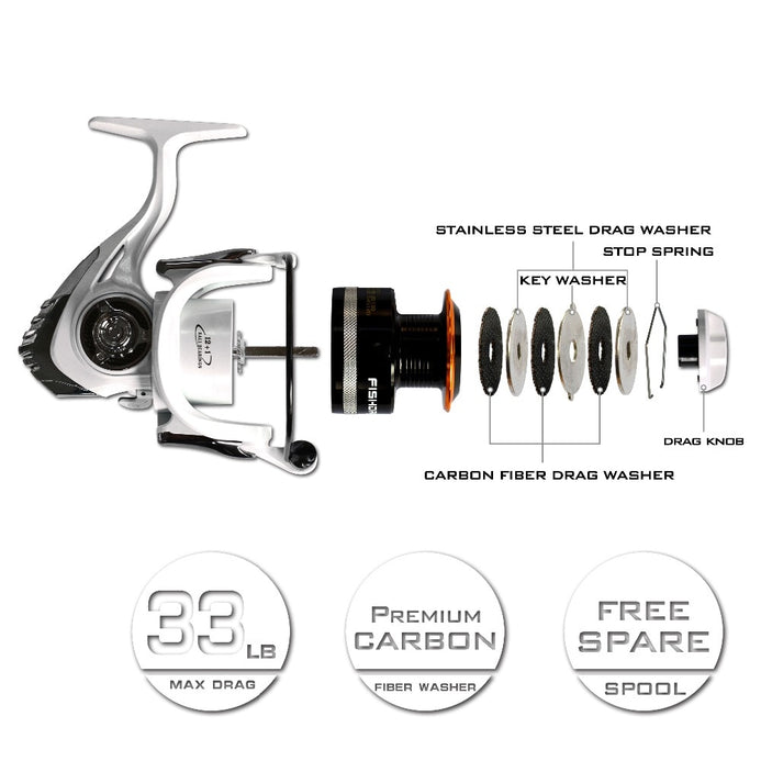 Carbon Fiber Drag System - Makes the brake drag power up to 19 KG (41.8lbs), and makes the drag more powerful, smooth and reliable.