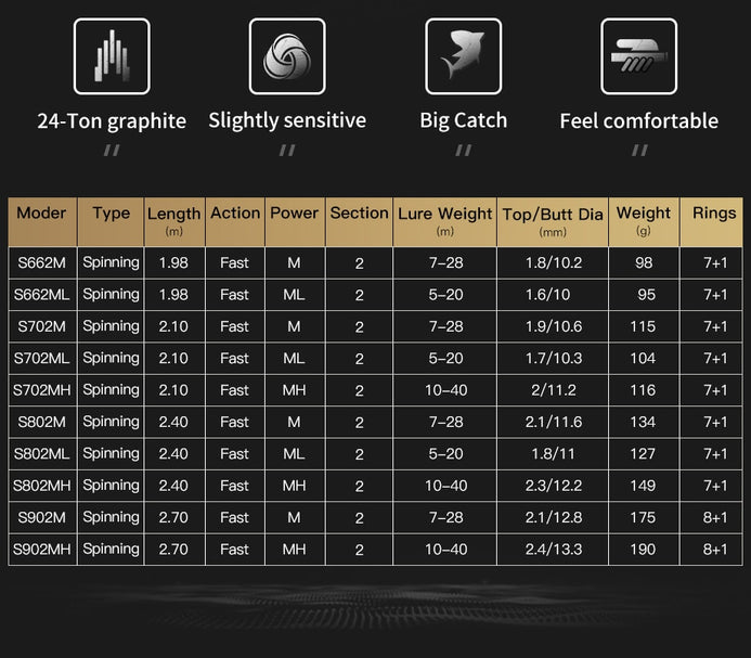 1.The blanks are made from 24 ton carbon and come in a variety of lengths, actions and power ratings to adapt to a variety of fishing