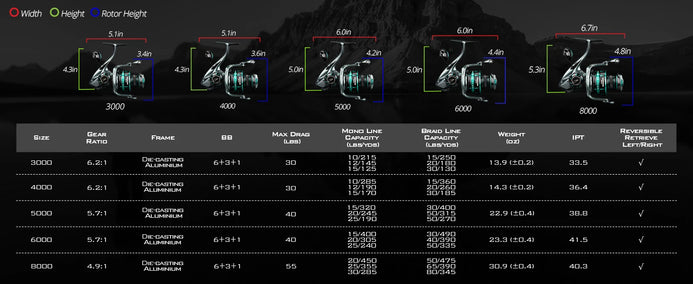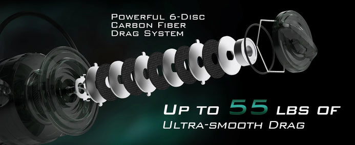 EXCEPTIONALLY STRONG & SMOOTH DRAG: This premium saltwater spinning reel is designed with a powerful braking force for hard fighting fish. Sizes 3000/4000 have an ultra-smooth triple-disc carbon fiber drag system and 30lbs max drag; 5000/6000 have a quad-disc carbon fiber drag system with 40lbs max drag; 8000 have a special double drag system, that consist of five front carbon fiber discs and one oversized spool carbon disc, to provide 55lbs max drag. Perfect for saltwater, big game fish.