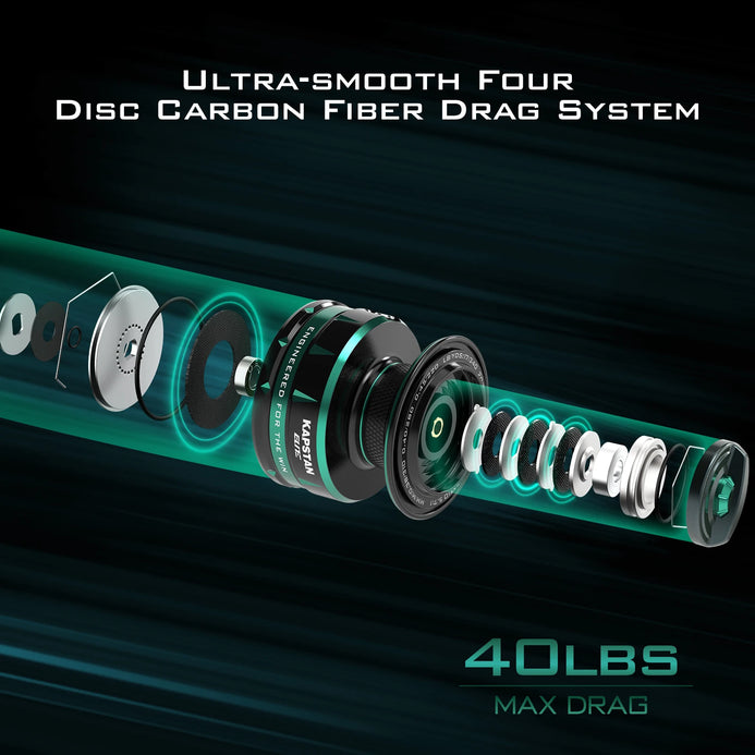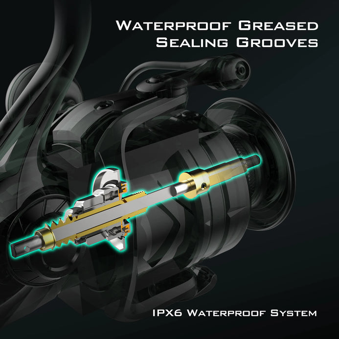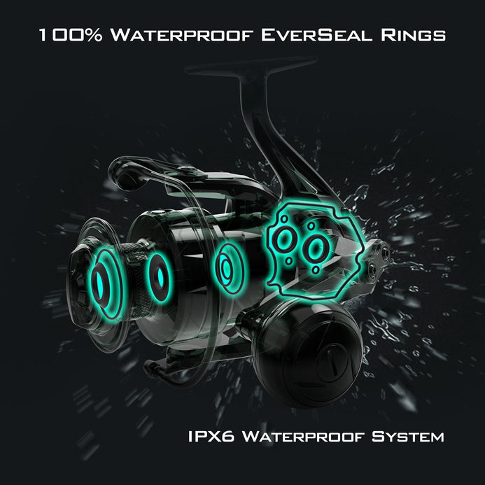 Kapstan Elite High Speed Spinning Reel is KastKing’s highest level 100% Waterproof fishing reel at IPX6 designation, with up to 15 EverSeal rubber rings to keep water out of the main gear. The amazing K.I.S.S. system includes labyrinth-style greased sealing grooves that reduce rotational resistance and provide an innovative water-tight seal. Designed with a powerful braking force for reeling in Big Fish with up to 55lbs max drag.