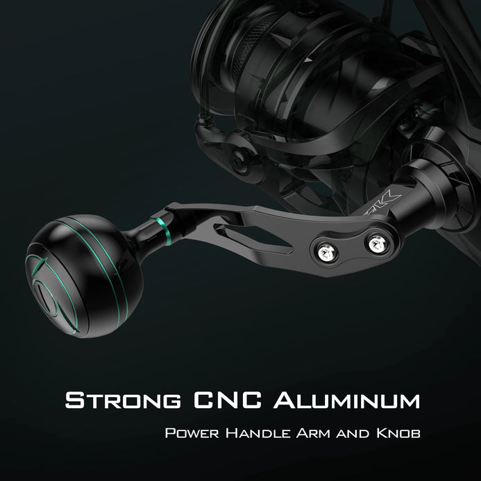 SUPER STRONG ALUMINUM BODY: Max-strength CNC aluminum frame construction. Sizes 3000/4000 have a carbon fiber rotor for strength with reduced weight. Sizes 5000/6000/8000 offer a CNC Aluminum Rotor for extra-strength in fishing. The large power handle and knob are machined from solid aluminum to provide incredible cranking power. This spinning reel has the strongest overall design for offshore sport-fishing, deep-sea game fishing, and blue water fishing. Great for monster fish in freshwater also