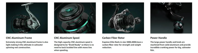 ULTRA-SMOOTH, FAST & RELIABLE: Kapstan Elite saltwater spinning reel is equipped with 6 double-shielded stainless steel ball bearings that provide a superbly smooth feel even in rough conditions. Plus 3 special-designed polymer roller bearing that is high-strength and never rust, and one 8-pin stainless steel one-way bearing to prevent the flywheel from reversing. Size 3000-4000 offer 6.2:1 faster retrieve, size 5000-6000 offers 5.7:1 and size 8000 provides 4.9:1 gear ratio.