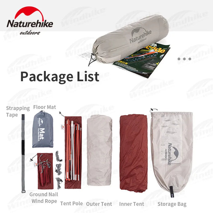 Package List: Outer Tent / Inner Tent / Tent Pole / Ground Nail*11 / Wind Rope*3 / Floor Mat / Strapping Tape / Storage Bag