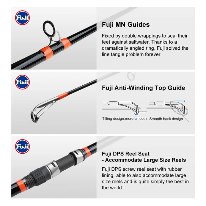 Fixed by double wrappings to seal their feet against saltwater. Thanks to a dramatically angled ring, Fuji solved the line tangle problem forever.