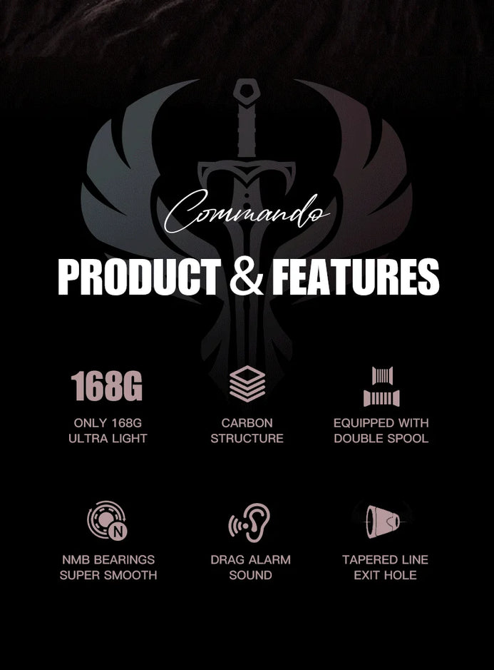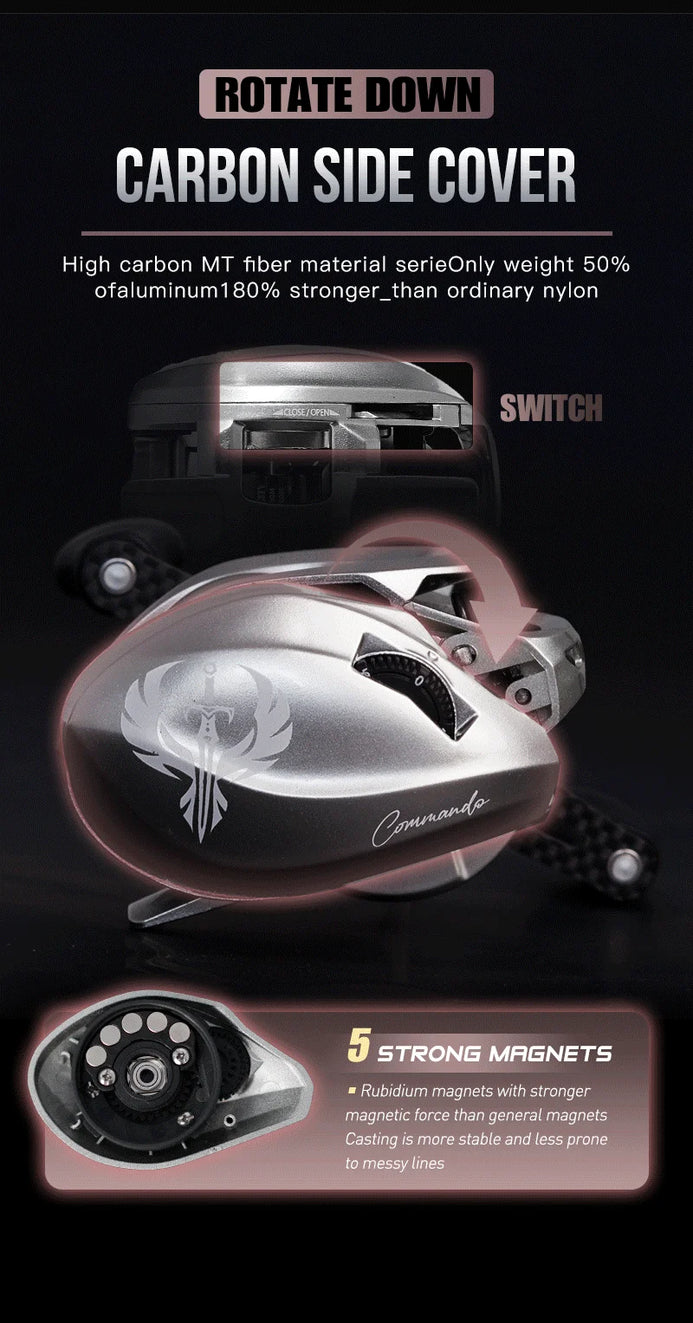 Commando has been designed and debugged for one year, a more compact design canextended product servicelife,Gear meshing and transmission are smoother and won't make noise, Smallergap means it won't stuck fishing line,Overall it's a Baitcasting reel that can fulfill all your demands,andcomfortable even after thousands of casts during a day of fishing.
