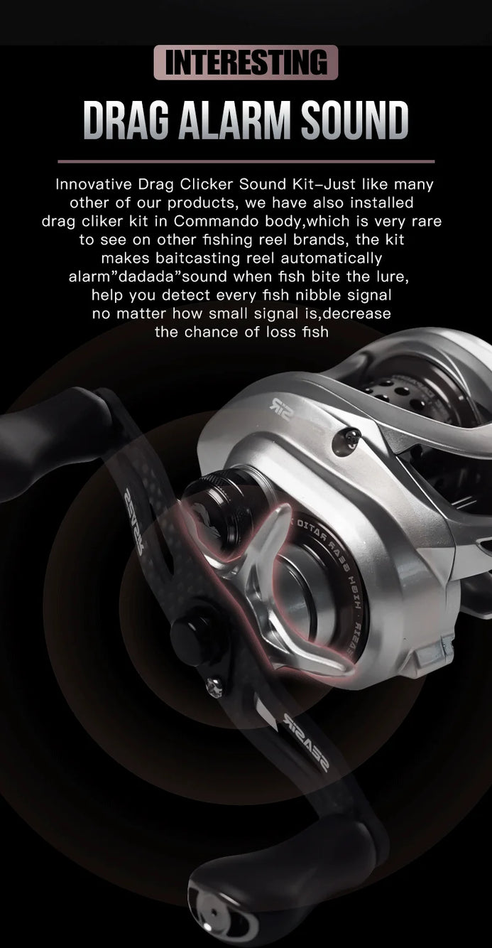 Innovative Drag Clicker Sound Kit-Just like many other of our products, we have also installed drag clikerkit in Commando body,which is very rare to see on other fishing reel brands, the kit makes baitcasting reelautomatically alarm“dadada”sound when fish bite the lure, help you detect every fish nibble signal no matterhow small signal is,decrease the chance of loss fish.