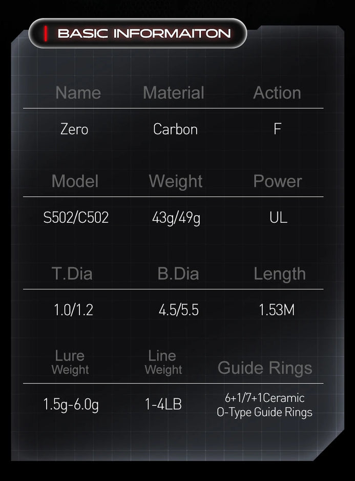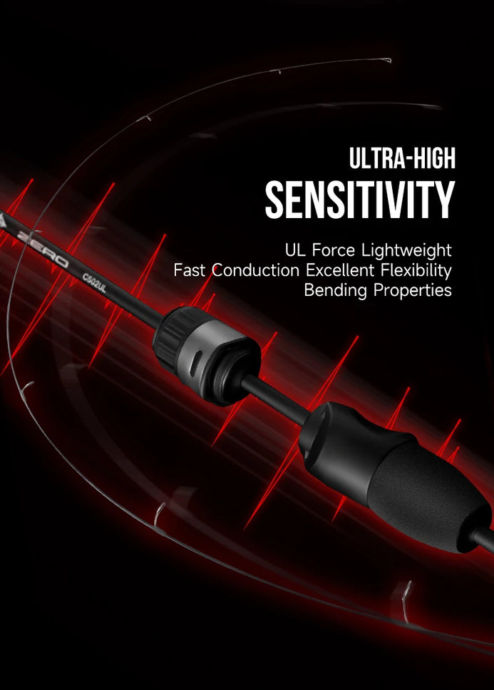 The Zero Rod Starts With An Amazing carbon 30T+Boron-Carbon, Hollow Rod Slightly , Which Not Only Ensures The Overall Strength, Sensitivity And Accuracy, But Also Provides a Lighter Weight Fishing Rod To Keep The Power Flowing,5ft Weighs Only 43-49g. Ultra-Lightweight Design ,You Won't Feel Tired Even After Long-Term Use