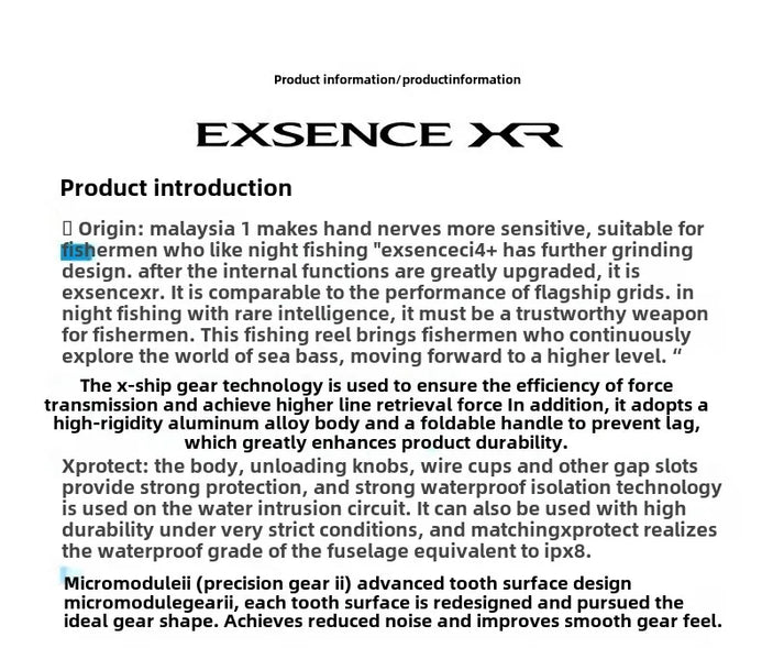 After further refining its design and significantly upgrading its internal functions, EXSENCE CI4+is now the EXSENCE XR. With performance comparable to flagship specifications, it can surely become a reliable weapon for anglers in night fishing with scarce intelligence. This fishing vessel brings anglers who constantly explore the world of sea bass to higher heights. The use of X-SHIP gear technology ensures force transmission efficiency and achieves higher wire collection force. In addition, the product features a high rigidity and durability aluminum alloy body, as well as a foldable handle to prevent jamming, greatly enhancing its durability. X Protect: The body, unloading knob, wire cup, and other clearance areas provide strong protection against water intrusion on the circuit using strong waterproof isolation technology. It can also demonstrate high durability under extremely harsh conditions, and when paired with XPROTECT, it achieves a waterproof rating equivalent to IPX8 on the body. MICROMODULEI (Precision Gear I) advanced tooth surface design MICROMODULE GEARI, each tooth surface is redesigned to pursue the ideal gear shape. Achieved noise reduction and improved smooth gear feel.