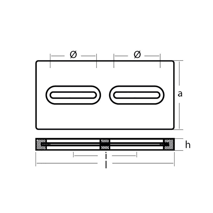 This rectangular plate anode is designed to be installed on the hull of a boat. The slotted holes in the plate prevent the need for drilling and give divers the ability to install them underwater. Much like other anodes, this anode works by absorbing corrosion and preventing it from reaching other metallic surfaces of a boat.