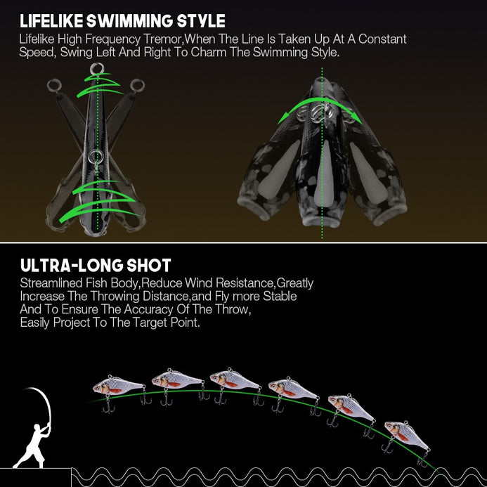 2) Rattling steel ball inside lures to keep balance ,offer lifelike swimming action in water.Noise model design,make VIB more easily to be sensed.