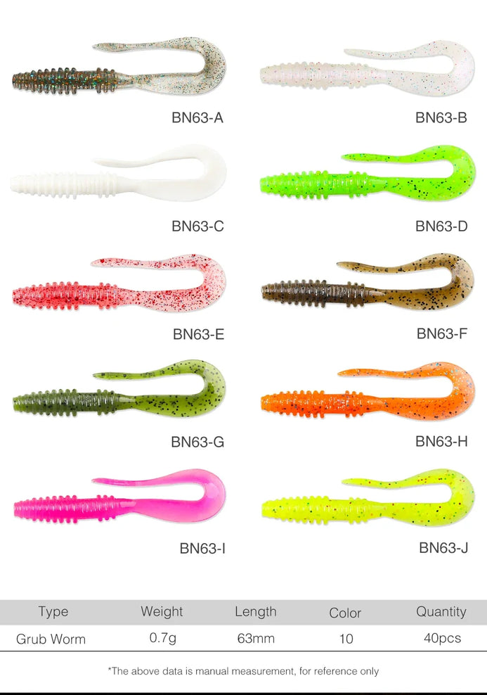 - Tsurinoya 40pc Grub Lure Set 63mm 0.7g